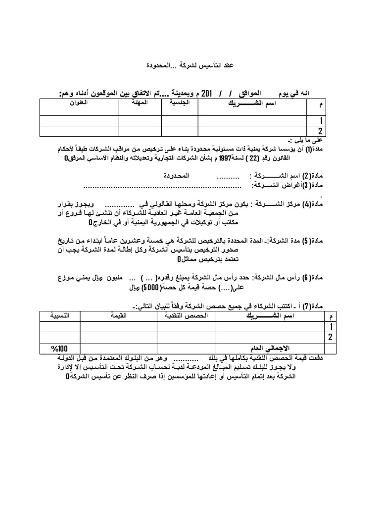 نموذج عقد التأسيس لشركة المحدودة